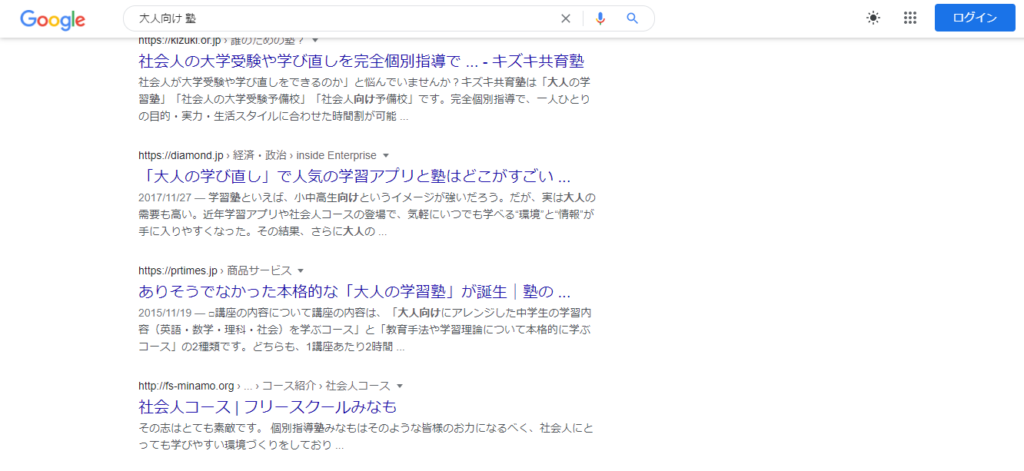 実際に、「大人向け 塾」でググってみました。